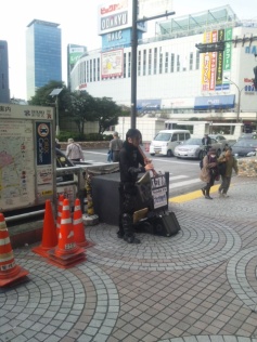 新宿西口は、いろんな芸人が日々、明日への夢を信じながら演奏しているのだが、この幻想尺八奏者は異色の存在ではなかろうか…黒の甲冑もどきのものを身に付け長い髪に隠れた顔は、一見見ると女性かと思ってしまう。アスファルトジャングルの無機質な環境の中では、とても心地好い尺八の音色は、どことなく宗教的で、「皆さん、邪心を取り除き、無心になりなさい…」なんてメッセージを届けている感じがする。目の前には、いくつかの宗教団体の勧誘合戦が繰り広げられているのだが、彼の尺八の音色をBGM代わりに上手く利用しているに違いない。心洗われる音色を聴かせながら、神さんの教えをもっともらしく説いてる皆さん、この尺八奏者にお布施のお金を払わんといかんですばい!